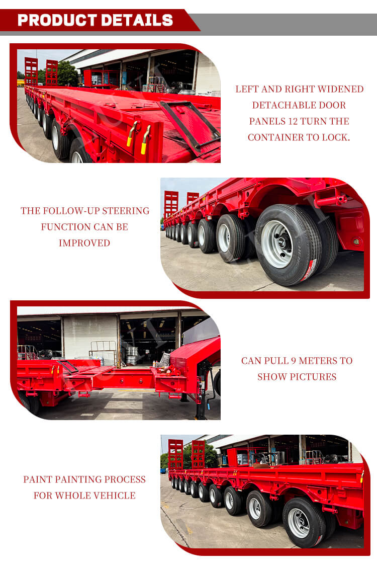 Оснащенный 10-осной усиленной конструкцией и в сочетании с пневматической или листовой рессорной подвеской, прицеп обеспечивает исключительную устойчивость при движении. Неподвижная конструкция «гусиная шея» обеспечивает надежную тягу, а гидравлическая или ручная лестница облегчает погрузку и разгрузку груза. В стандартную комплектацию входит 28-тонное шасси для стабильной и долговечной поддержки, а цвет можно настроить по мере необходимости. Благодаря отличной конструкции и строгому контролю качества он подходит для перевозки тяжелых грузов, таких как крупногабаритное оборудование и инженерные компоненты, обеспечивая эффективное и безопасное решение для логистической и транспортной отрасли.