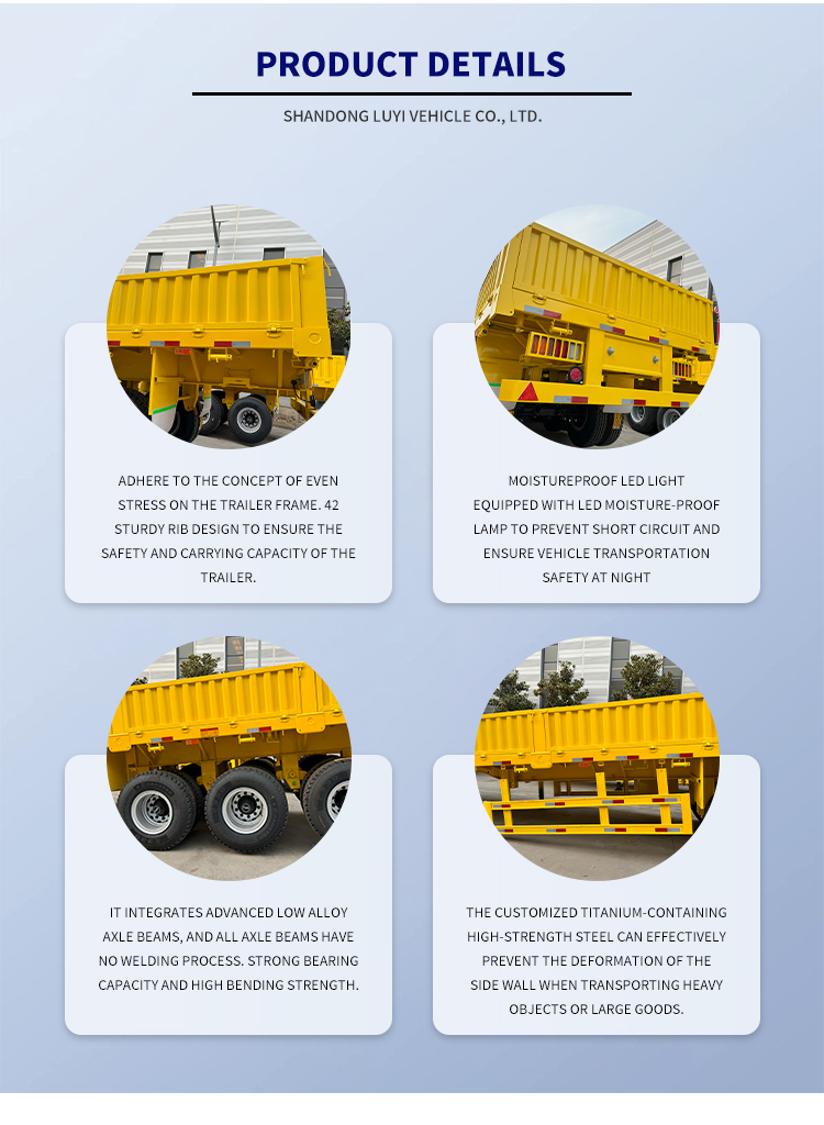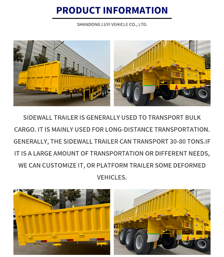 13-метровый 3-осный полуприцеп из стали и алюминия LUYI, родом из провинции Шаньдун, Китай, представляет собой совершенно новый полуприцеп с боковой стенкой, специально разработанный для грузовых перевозок грузовыми автомобилями. Изготовленный из высококачественной стали, прицеп сочетает в себе прочность конструкции и долговечность, а максимальная полезная нагрузка составляет 20 001–25 000 кг, что позволяет легко удовлетворить потребности в перевозках средних и тяжелых грузов.