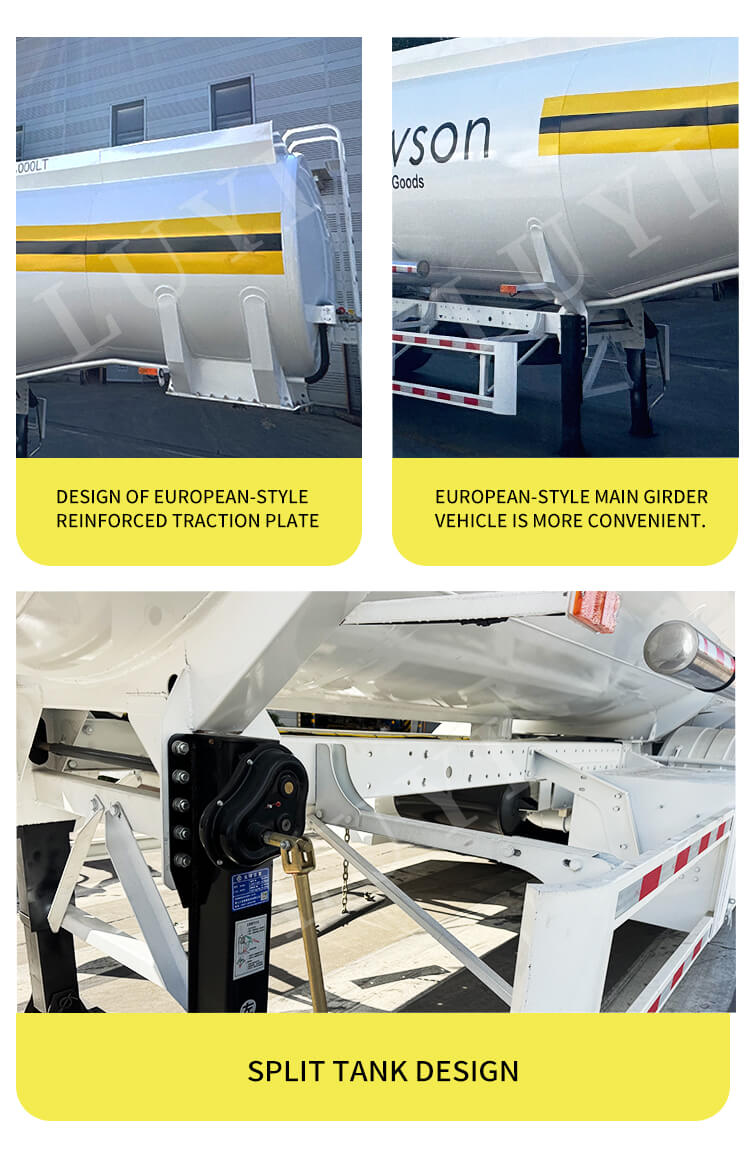 Прицеп может похвастаться прочными и надежными конструкциями. Он оснащен 13/16-тонными мостами таких брендов, как Fuwa, BPW или BERKLEY, и может быть оснащен опциональной механической или пневматической подвеской. Он совместим с шинами различных спецификаций, включая 11.00r20, 12r22.5, 315 и 385, обеспечивая стабильное вождение и адаптируемость к различным дорожным условиям. Он поставляется со стандартным 28-тонным шасси и шкворнями 50#/90# для удобной и безопасной эксплуатации. Поддерживая индивидуальные цвета кузова, продукт сочетает в себе практичность и персонализацию, обеспечивая стабильное и гибкое профессиональное решение для перевозки дизельного топлива.