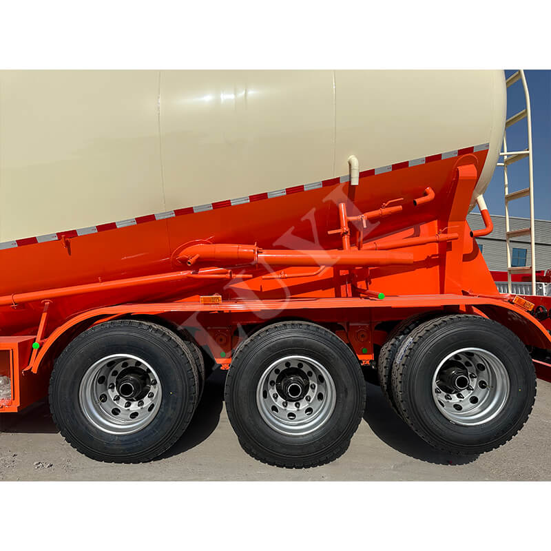 Габариты прицепа 10500×2550×4000 мм. Он оснащен двумя вариантами механической/пневматической подвески в сочетании с 3-осной устойчивой конструкцией и 28-тонными выносными опорами повышенной прочности для обеспечения устойчивости во время парковки и движения. Двухлинейная тормозная система повышает безопасность. Варианты шин включают различные спецификации, такие как 11.00r20 и 12r22.5, а шкворень доступен в двух моделях: JOST 50 мм / 90 мм. Кроме того, цвет можно настроить в соответствии с потребностями, полностью адаптируясь к различным сценариям транспортировки и эстетическим требованиям, что делает его надежным оборудованием для перевозки цемента насыпью.