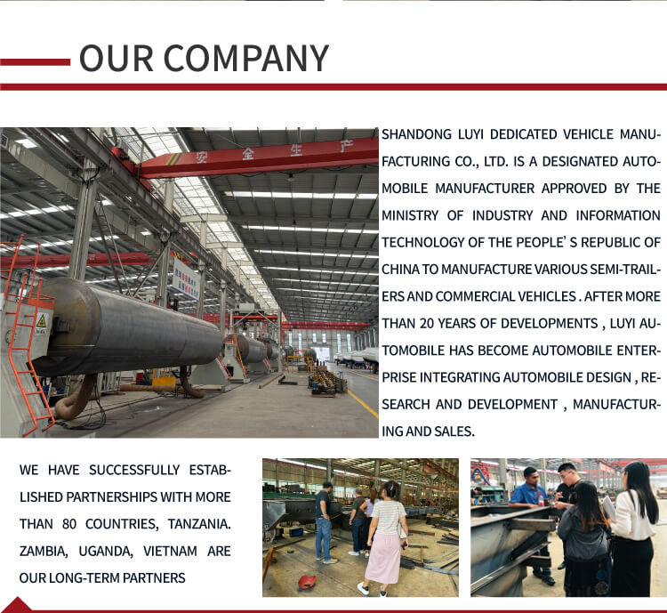 -Наша фабрика:Шаньдунская компания Luyi Vehicle Co., Ltd. является одним из квалифицированных производителей различных прицепов, таких как низкорамные полуприцепы, бортовые прицепы, грузовые прицепы, каркасные полуприцепы-контейнеры, 50-футовые бортовые прицепы и т. д. Благодаря высокому стандарту машинного и автоматического оборудования, мощной команде исследований и разработок и элитной команде продаж мы построили длительные деловые отношения со многими всемирно известными предприятиями, такими как SINOTRUK, SHACMAN и т. д.