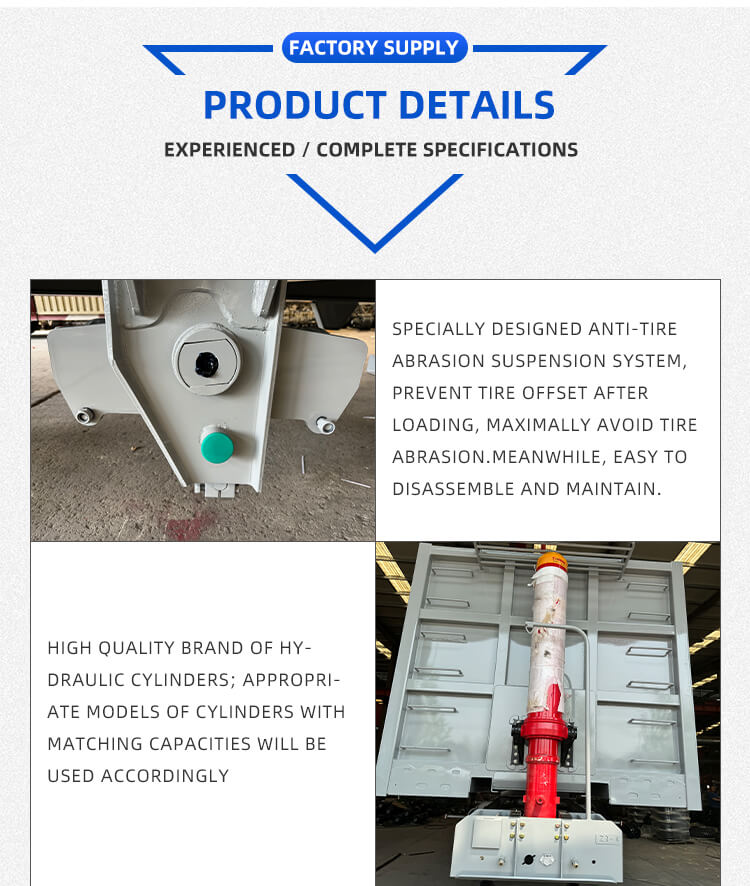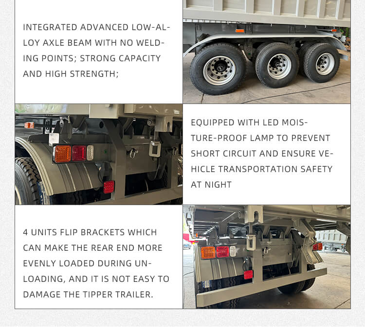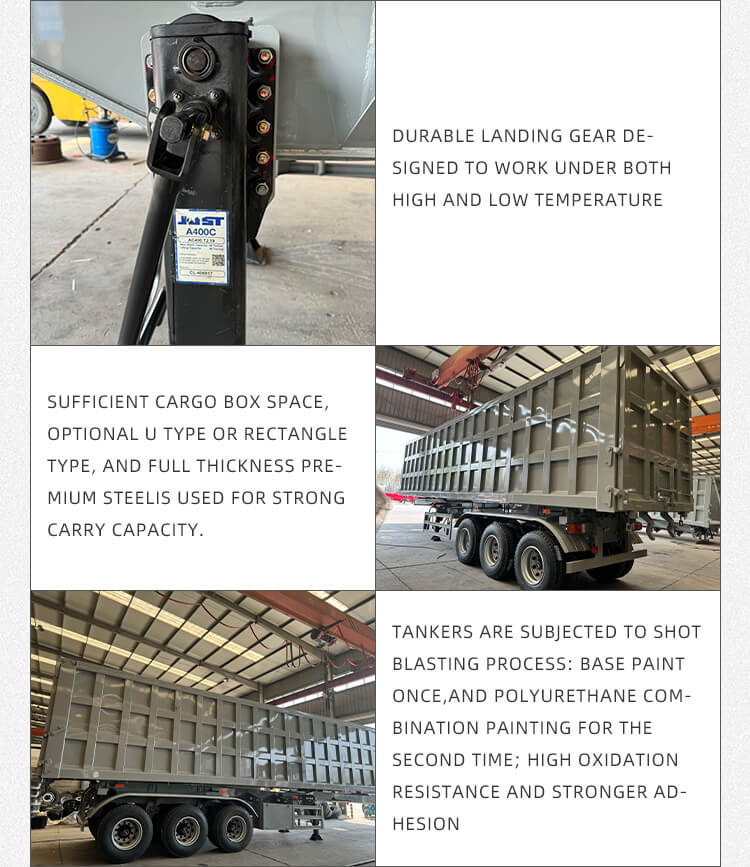Он предлагает гибкие конфигурации для удовлетворения разнообразных потребностей: варианты осей включают 2/3/4 оси от надежных брендов BPW и FUWA, а также механическую или пневматическую подвеску на выбор для стабильного вождения. Оснащенный шинами 12R22,5, стандартным 28-тонным шасси и шкворнями JOST размером 2 дюйма (50 мм)/3,5 дюйма (90 мм), он обеспечивает высокую адаптируемость. Процесс окраски полиуретаном повышает долговечность, цвет можно настроить, а на него предоставляется шестилетняя гарантия, что делает его надежным при длительных перевозках песка и гравия.