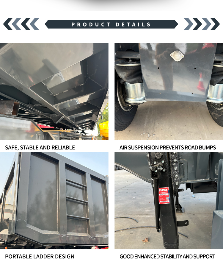 Этот 3-осный самосвальный полуприцеп с задней разгрузкой, черным покрытием и прямоугольной конструкцией грузового кузова, специально создан для саморазгрузки и перевозки сыпучих материалов. Он широко применим в таких сценариях, как шахты, строительные площадки и транспортировка строительных материалов. Трехосная компоновка значительно повышает грузоподъемность и устойчивость при движении, идеально удовлетворяя требованиям по тяжелым нагрузкам и допустимым ограничениям. Прямоугольный грузовой кузов имеет регулярный объем (25–42 куб. м), что обеспечивает более высокую эффективность погрузки, а высокопрочная стальная рама гарантирует долговечность конструкции.