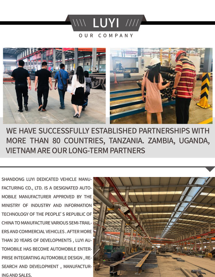Luyi Semi Trailer Manufacturing Co., LTD специализируется на производстве всех видов полуприцепов цементовозы нефтецистерны самосвальные полуприцепы полуприцепы-контейнеры полуприцепы с плоскими панелями полуприцепы-каркасы полуприцепы сараи полуприцепы низкопанельные