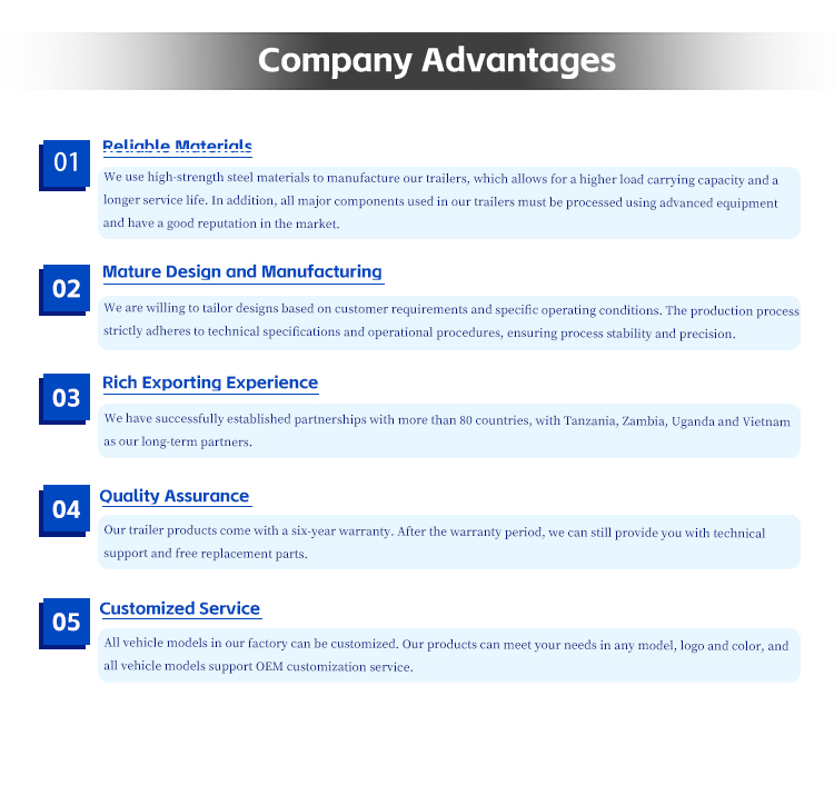 Отправьте нам свой запрос, чтобы получить индивидуальное предложение, основанное на ваших фактических транспортных требованиях. Сообщите нам тип прицепа, груз или грузоподъемность, дорожные условия, пункт назначения и количество, и наша команда ответит подходящей рекомендацией как можно быстрее.