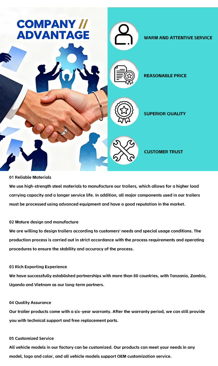 Отправьте нам свой запрос, чтобы получить индивидуальное предложение, основанное на ваших фактических транспортных требованиях. Сообщите нам тип прицепа, груз или грузоподъемность, дорожные условия, пункт назначения и количество, и наша команда ответит подходящей рекомендацией как можно быстрее.