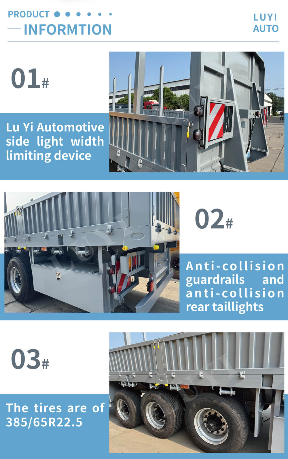 3-осный полуприцеп с бортовой стенкой и колоннами торговой марки LUYI, базирующейся в Шаньдуне, Китай, является оптимальным выбором для перевозки сыпучих грузов и контейнеров. Изготовленный из высококачественной стали, он имеет точные размеры 12500x2500x1600 мм и максимальную грузоподъемность 60 тонн, чья мощная несущая способность может легко удовлетворить различные потребности в тяжелой транспортировке.