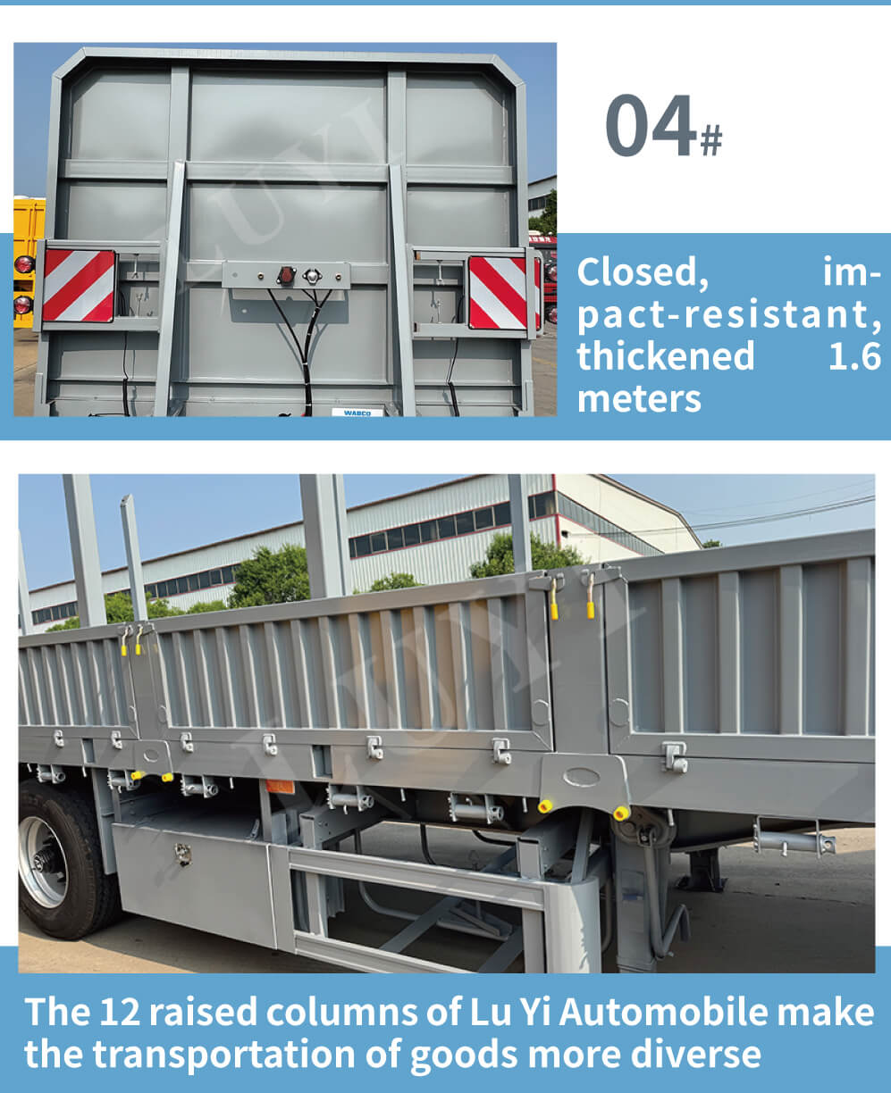 Трехосный полуприцеп с бортовой стенкой и колоннами от LUYI, бренда, базирующегося в Шаньдуне, Китай, является оптимальным выбором для перевозки сыпучих грузов и контейнеров. Изготовленный из высококачественной стали, он имеет точные размеры 12500x2500x1600 мм и максимальную грузоподъемность 60 тонн, чья мощная несущая способность может легко удовлетворить различные потребности в тяжелой транспортировке.