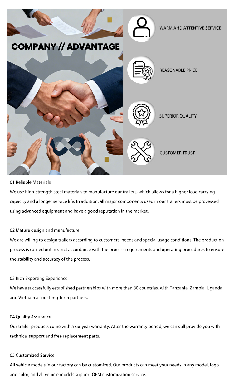 Отправьте нам свой запрос, чтобы получить индивидуальное предложение, основанное на ваших фактических транспортных требованиях. Сообщите нам тип прицепа, груз или грузоподъемность, дорожные условия, пункт назначения и количество, и наша команда ответит подходящей рекомендацией как можно быстрее.