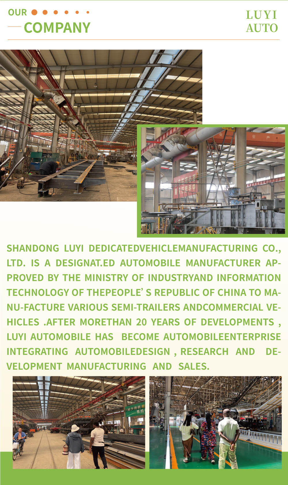 Наш завод производит не только тракторы, но также самосвалы, поливальные машины, автокраны, автобетоносмесители, самосвалы, прицепы-цистерны, низкорамные прицепы, прицепы для пылеудаления и т. д. Наш завод является крупным по размеру и может изготовить различную продукцию в соответствии с различными требованиями клиентов.
